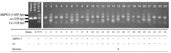 図.カラムナー性のリンゴの日持ち性の改良を行うため,‘きたろう’(通常型樹形)×8-7573(カラムナー個体)に由来するF1集団から,減数分裂時の組み換えによってMdPG1の不良日持ち性対立遺伝子MdPG1-3を持たないカラムナー個体(表のDecision行が“S”とマークされた15番の個体)を判別し,選抜した.約15000個体を供試して,このような個体を80個体選抜することができた.
